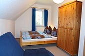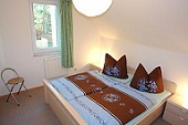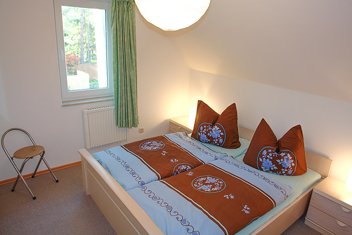 Die beiden mit Naturholzmöbeln ausgestatteten Schlafräume im Obergeschoss. Für entspannte Nächte sorgen jeweils Fliegen- gitter sowie blickdichte Ver- dunkelung vor den Fenstern.